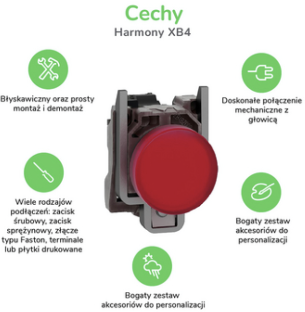 Służy jako element sterowania w panelach i szafach sterowniczych — operator naciska ją, aby wywołać określoną funkcję w układzie sterowania.