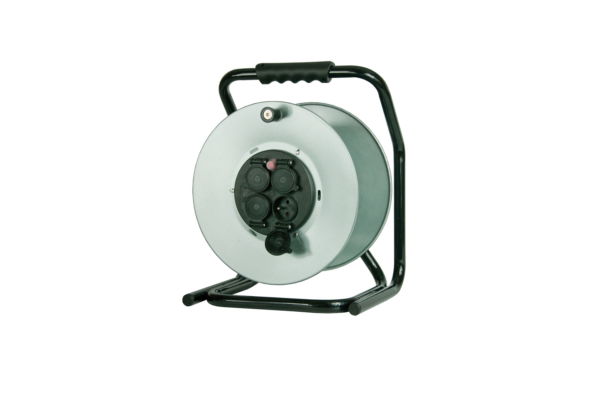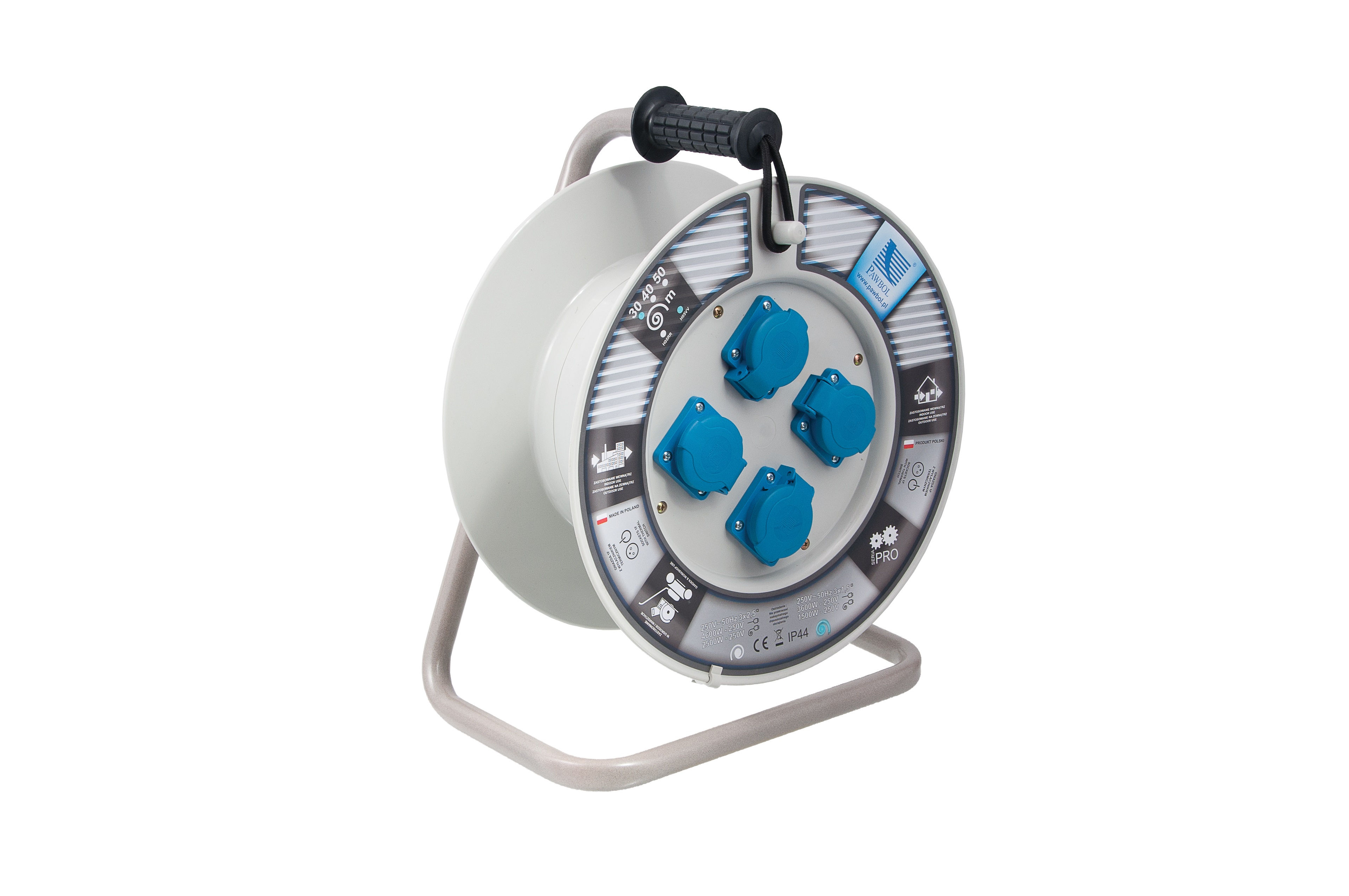 Obudowa urządzenia została wykonana z trwałego tworzywa sztucznego, a stopień ochrony IP44 zapewnia odporność na pył oraz bryzgi wody — co czyni ten rozgałęźnik odpowiednim również do użytkowania w warunkach częściowo zewnętrznych lub w mobilnych stanowiskach roboczych. Bęben o średnicy 300 mm umożliwia wygodne nawinięcie przewodu, a wyłącznik termiczny zwiększa bezpieczeństwo użytkowania przy większych obciążeniach.