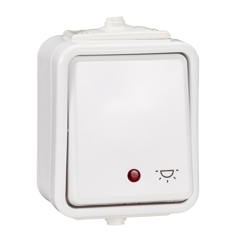 Trwałe i funkcjonalne rozwiązanie do sterowania oświetleniem w pomieszczeniach o podwyższonej wilgotności. Stopień ochrony IP44 zapewnia odporność na zachlapania, a solidna obudowa i klasyczny biały kolor sprawiają, że produkt doskonale sprawdzi się w garażach, łazienkach i pomieszczeniach technicznych.