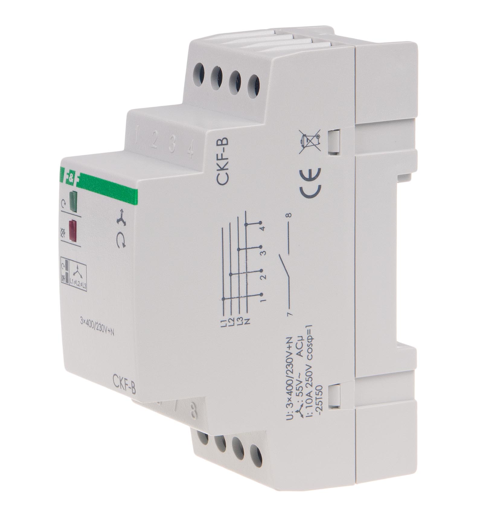 Przekaźnik CKF-316 to niezawodne urządzenie monitorujące parametry sieci trójfazowej. Chroni silniki oraz inne odbiorniki przed skutkami zaniku fazy, nadmiernej asymetrii napięć oraz niewłaściwej kolejności faz. W momencie wykrycia nieprawidłowości natychmiast reaguje, odłączając obciążenie z kilkusekundowym opóźnieniem, co pozwala uniknąć fałszywych wyłączeń. Dzięki kompaktowej obudowie modułowej i prostemu montażowi na szynie DIN, CKF-316 idealnie sprawdza się w automatyce przemysłowej, systemach pomp, wentylatorach i układach napędowych.