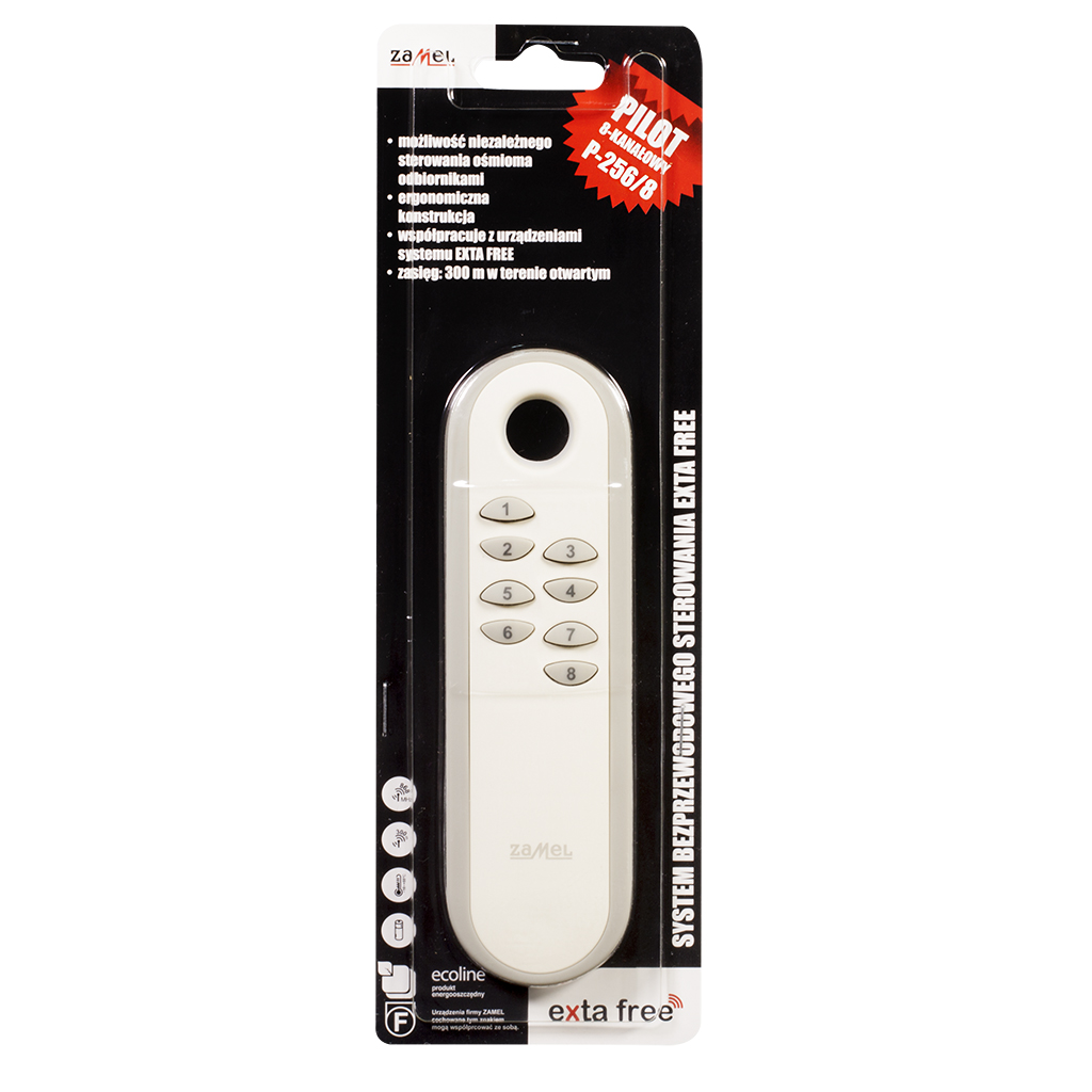 Pilot P-256/8 to wielofunkcyjne urządzenie systemu Exta Free, które umożliwia wygodne, bezprzewodowe sterowanie automatyką domową. Dzięki ośmiu niezależnym przyciskom można obsługiwać wiele odbiorników lub grup urządzeń jednocześnie — np. oświetlenie, rolety, gniazda czy bramy garażowe.