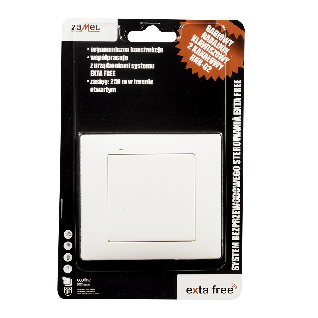 Nadajnik RNK-02 to kompaktowy, klawiszowy pilot (2 kanały) w systemie Exta Free, idealny do integracji z inteligentną instalacją bez konieczności układania przewodów sterujących. Montowany w puszce Ø 60 mm, umożliwia łatwą adaptację do istniejących instalacji ściennych — wystarczy podłączyć przycisk bez przewodów sterujących.