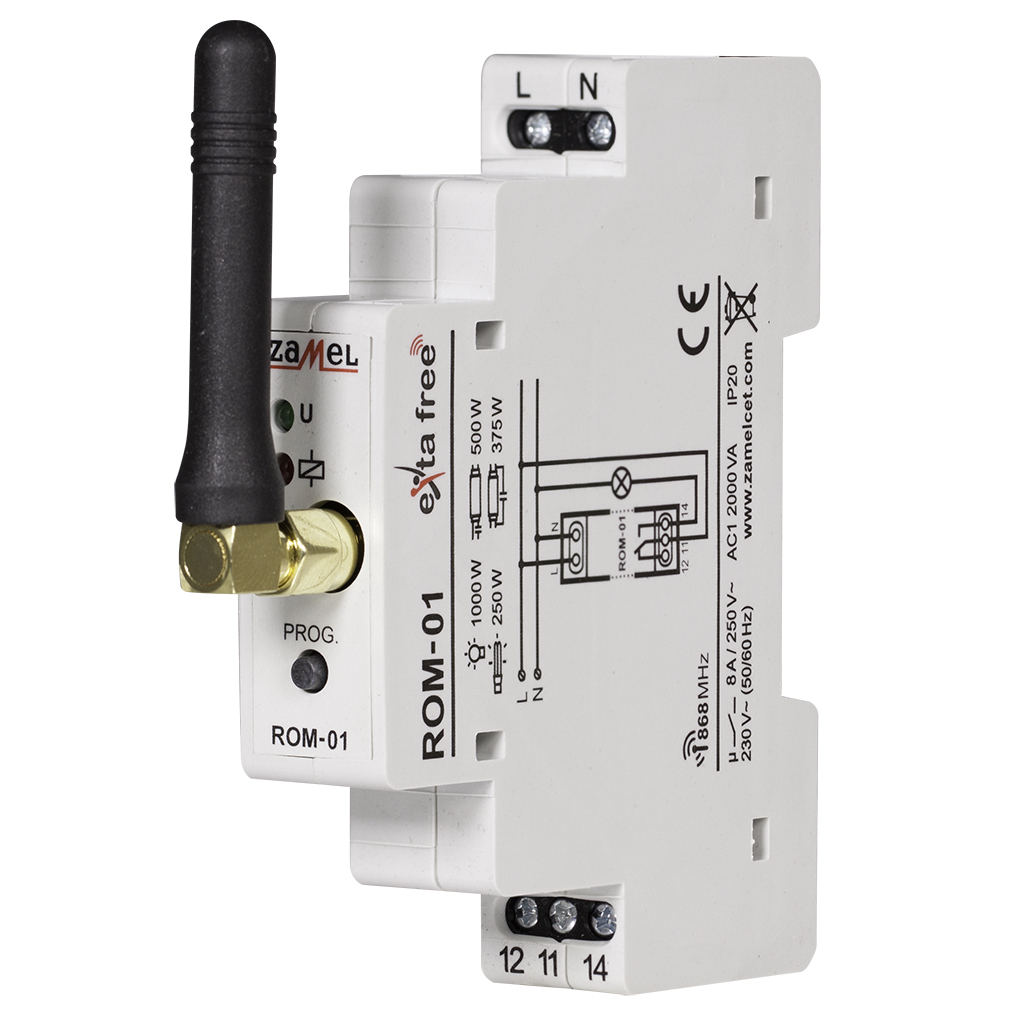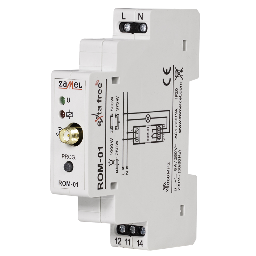 ROM-01 to radiowy modułowy odbiornik 1-kanałowy przeznaczony do stosowania w automatyce budynkowej w systemie EXTA FREE. Montowany na szynie DIN (TH-35), umożliwia bezprzewodowe sterowanie urządzeniami 230 V (np. oświetleniem, napędami, przekaźnikami) bez konieczności prowadzenia przewodów sterujących.