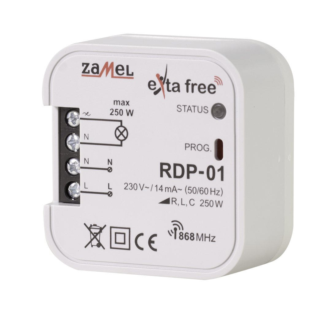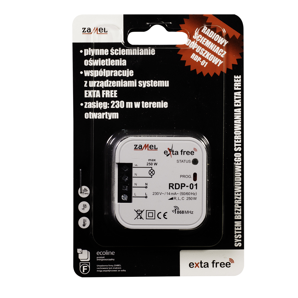 Radiowy ściemniacz dopuszkowy RDP-01 to eleganckie i wygodne rozwiązanie do sterowania oświetleniem w systemie Exta Free. Montowany w puszce podtynkowej, umożliwia zdalną regulację jasności światła za pomocą pilota radiowego — bez potrzeby stosowania przewodów sterujących. Idealny do salonów, sypialni, biur i miejsc, gdzie chcesz uzyskać komfort sterowania światłem poprzez radio, a nie tradycyjne ściemniacze.