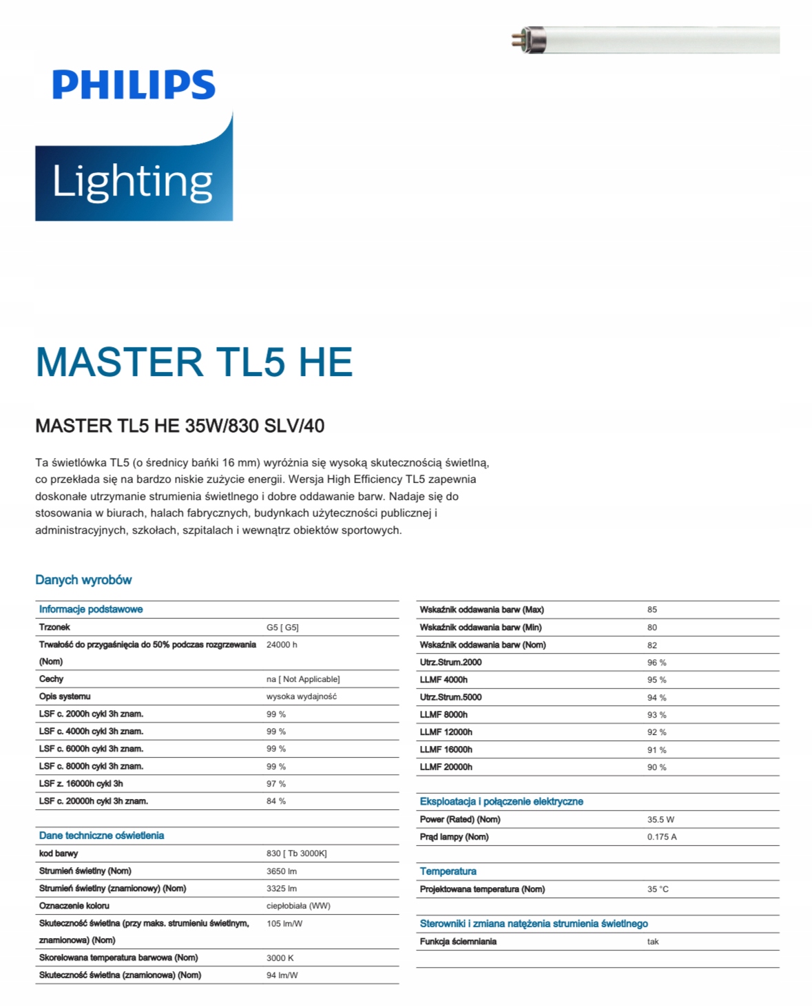 Wydajne źródło światła typu T5, przeznaczone do nowoczesnych instalacji oświetleniowych w biurach, magazynach i obiektach użyteczności publicznej. Zapewnia dużą ilość światła przy stosunkowo niskim zużyciu energii.