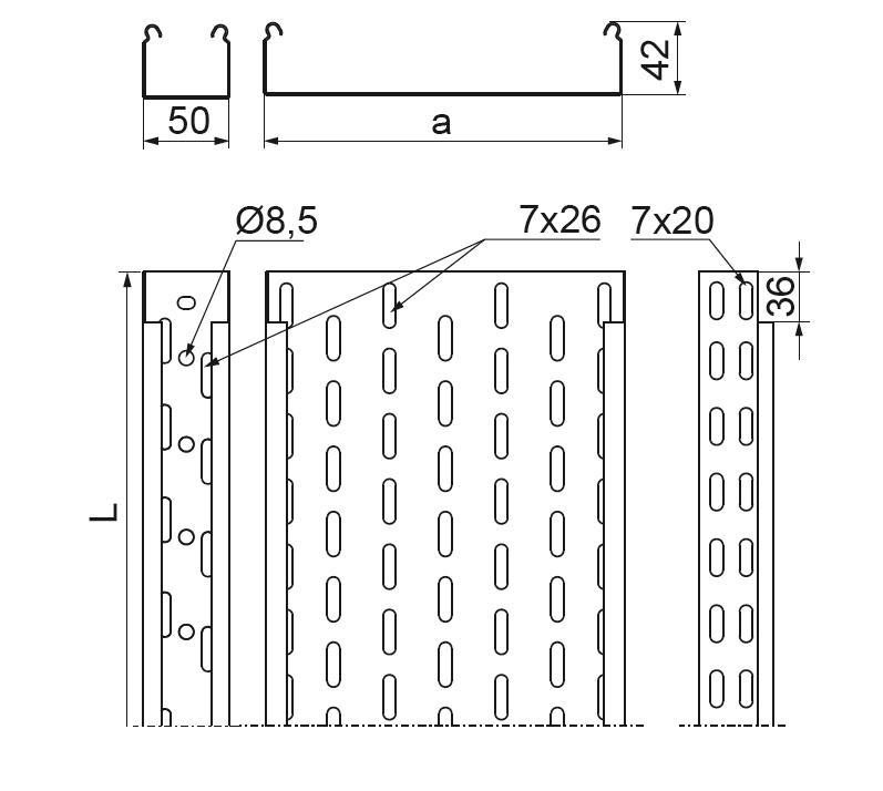 Korytko KGL/KCL50H42/2, blacha gr. 0,7 mm, BAKS