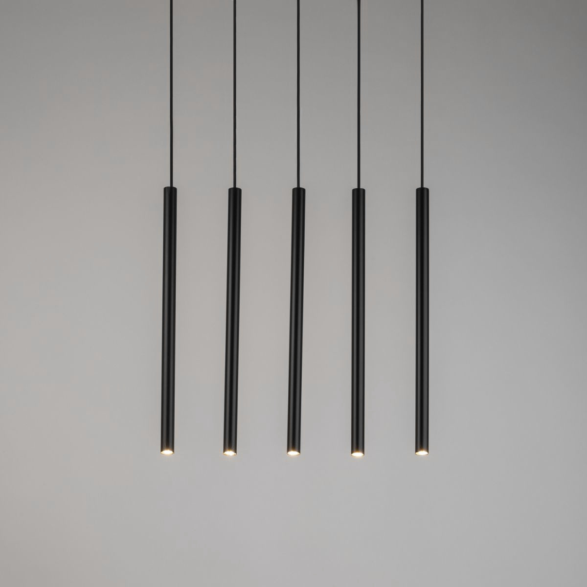 Nowoczesne i eleganckie oświetlenie w czarnym wykończeniu, zaprojektowane z myślą o minimalistycznych i loftowych wnętrzach. Pięć smukłych zwisów w formie rurek rozmieszczonych liniowo tworzy spójną, dekoracyjną kompozycję, idealną do montażu nad stołem, wyspą kuchenną lub blatem roboczym. Prosta forma i stonowana kolorystyka podkreślają charakter wnętrza, a regulowana wysokość zawieszenia umożliwia precyzyjne dopasowanie lampy do przestrzeni.