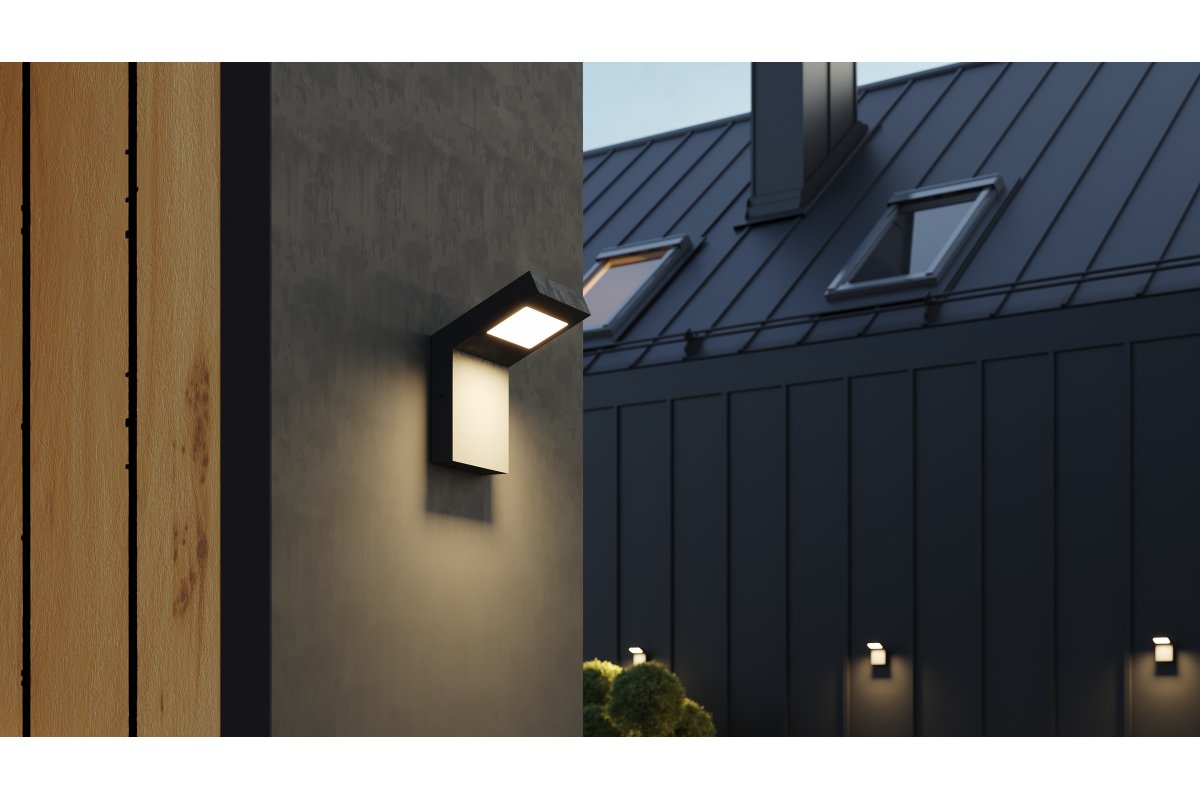 Nowoczesna oprawa elewacyjna przeznaczona do oświetlenia zewnętrznego. Minimalistyczny design i czarna, matowa obudowa doskonale komponują się z nowoczesną architekturą budynków. Neutralna barwa światła zapewnia komfortową widoczność po zmroku, podnosząc bezpieczeństwo oraz estetykę stref wejściowych, tarasów i elewacji.
