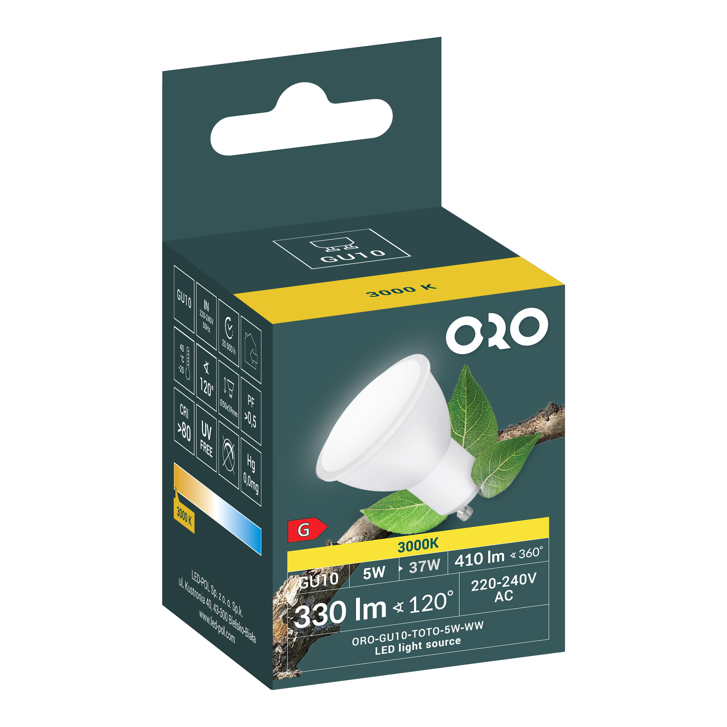 Żarówka LED GU10 cechuje się oszczędnością i uniwersalnością, o mocy 5W w barwie białej ciepłej, strumień świetlny 330lm - odpowiednik dawnej 37W żarówki. Posiada jedno z najpopularniejszych rodzajów mocowań bagnetowych. Żarówka jest idealnym rozwiązaniem do domu oraz pomieszczeń biurowych i przemysłowych.
