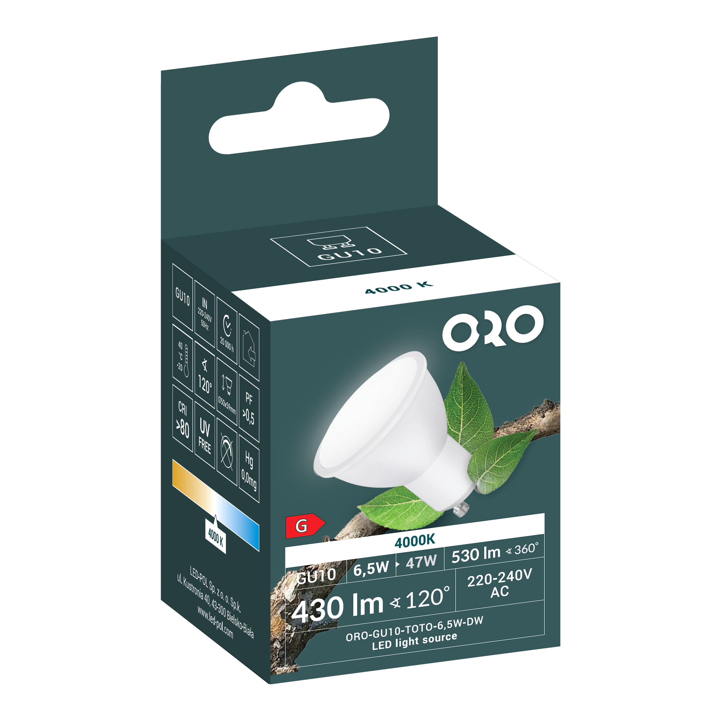 ORO-GU10-TOTO-6,5W-DW Lampa LED GU10 6,5W strumień użyteczny 430Lm 4000K 120° Fi50x55 klasa energetyczna G