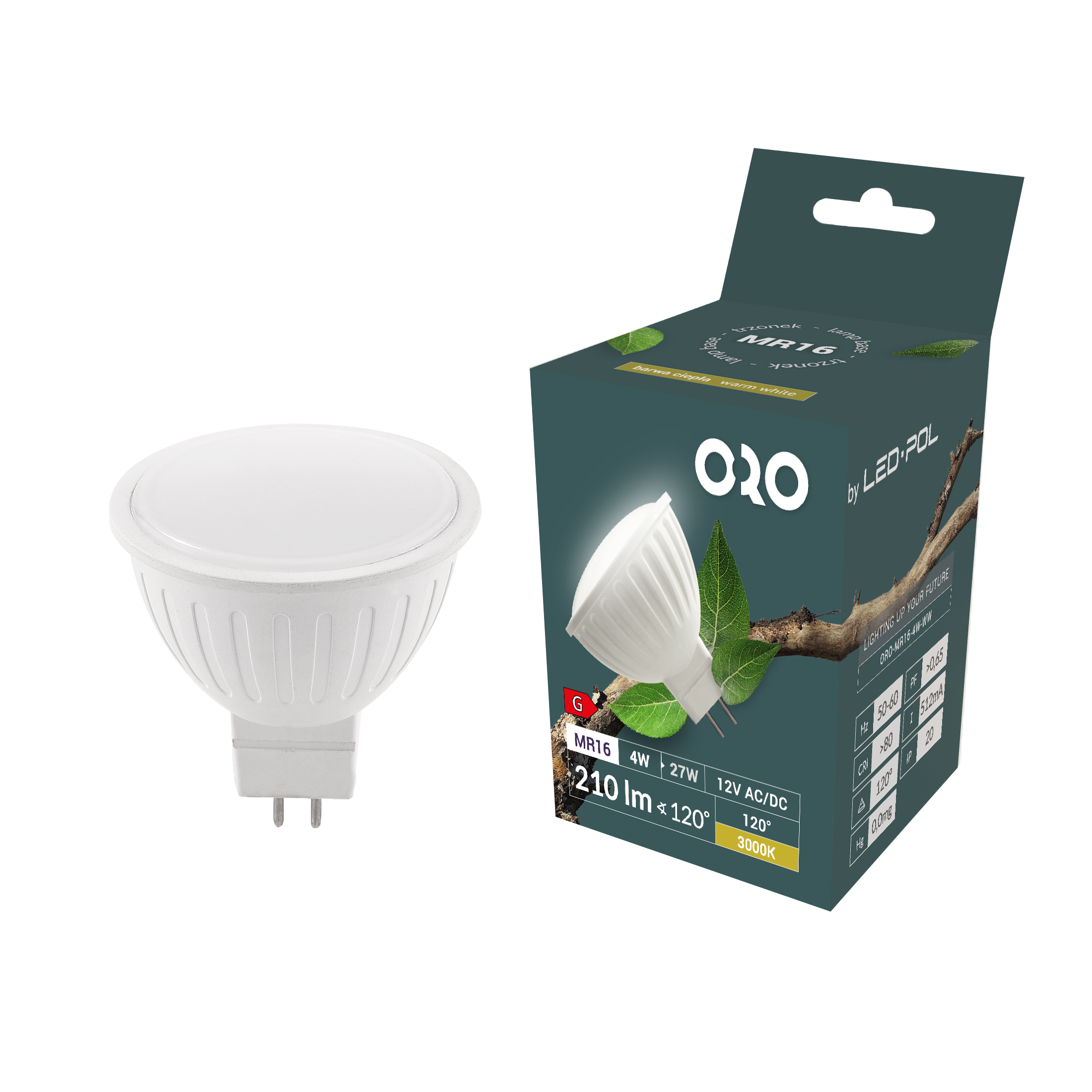 ORO-MR16-4W-WW Lampa LED Gu5.3 MR16 4W użyteczny strumień świetlny 210Lm 3000K 120° Fi50x49 zasilanie 12V, klasa energetyczna G