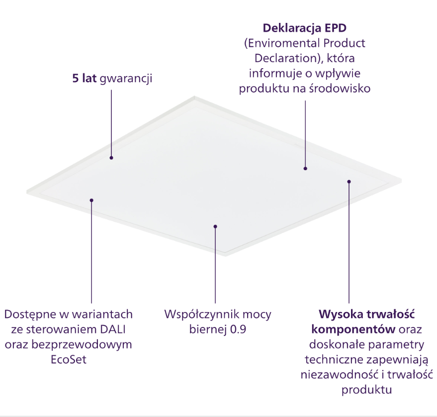 Panel jest przeznaczony do wnętrz, takich jak biura, sale lekcyjne, sklepy, korytarze i inne pomieszczenia użytkowe.