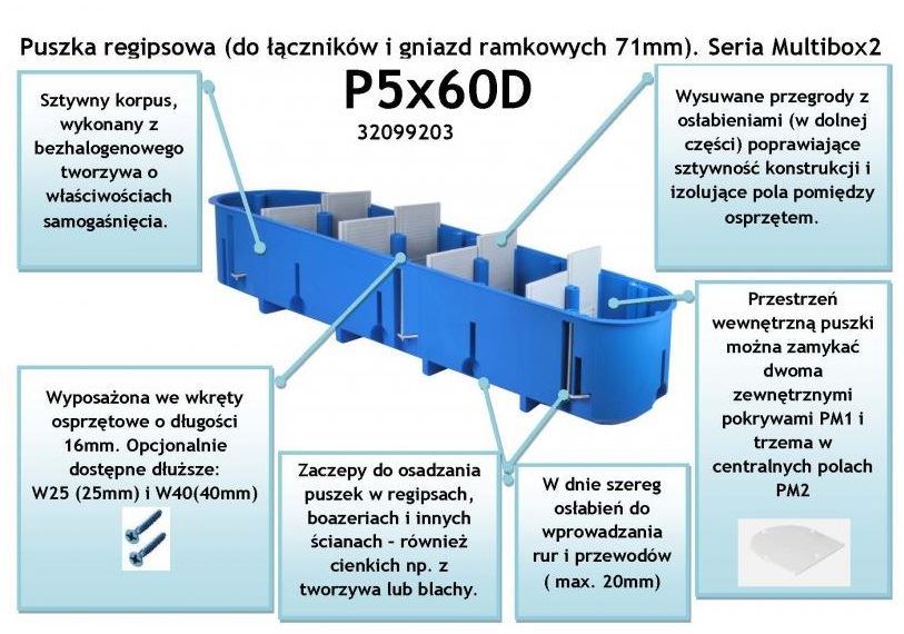 - Przeznaczenie: montaż gniazd, łączników i osprzętu elektrycznego w ścianach pustych