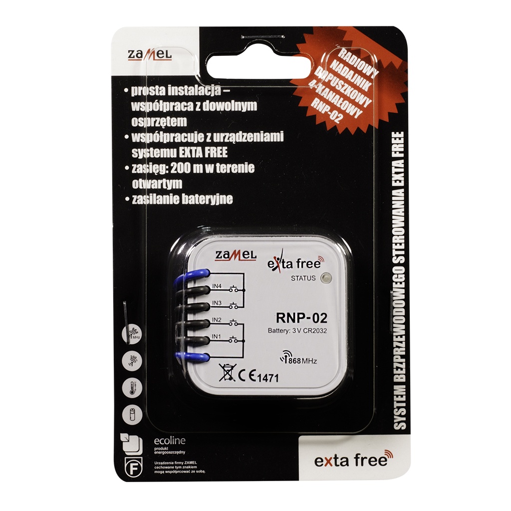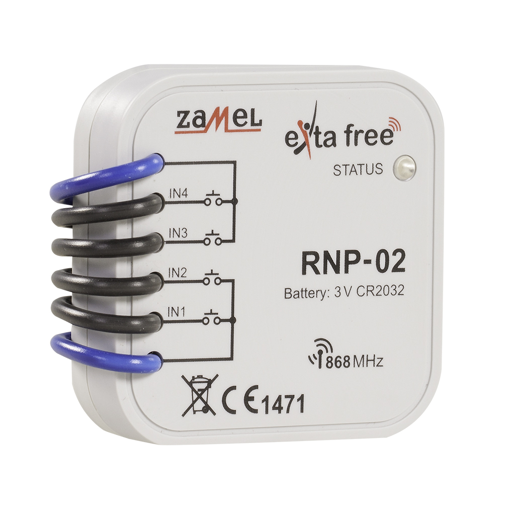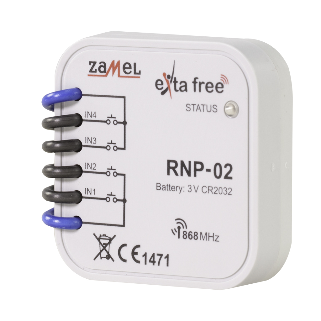 Radiowy nadajnik dopuszkowy RNP-02 to 4-kanałowe urządzenie systemu Exta Free, które pozwala sterować odbiornikami radiowymi w sposób szybki i wygodny, bez konieczności prowadzenia przewodów sterujących. Dzięki kompaktowej budowie nadajnik można łatwo zamontować w standardowej puszce instalacyjnej Ø 60 mm, co sprawia, że jest praktycznie niewidoczny w instalacji.