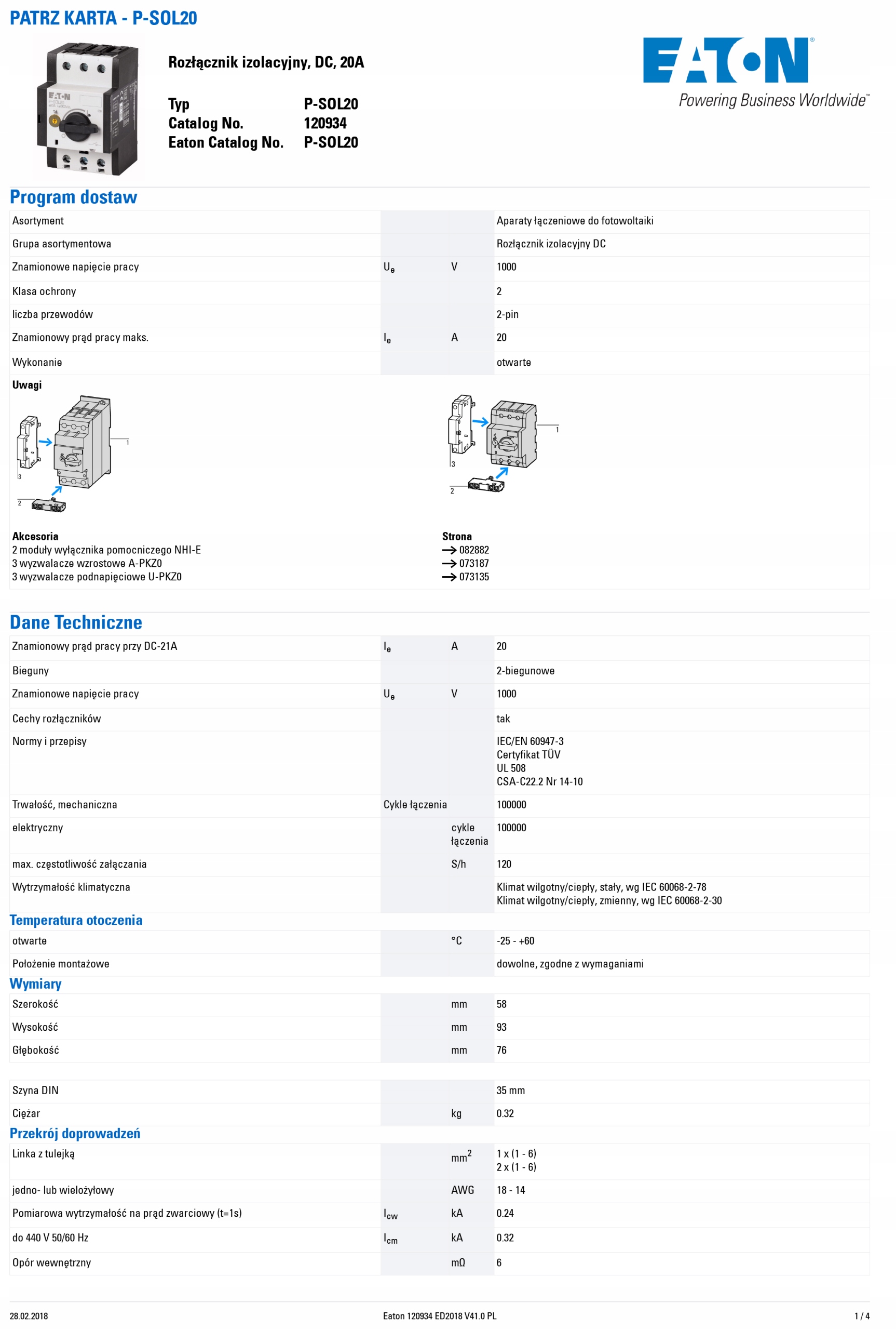 • Typ działania: rozłącznik izolacyjny prądu stałego