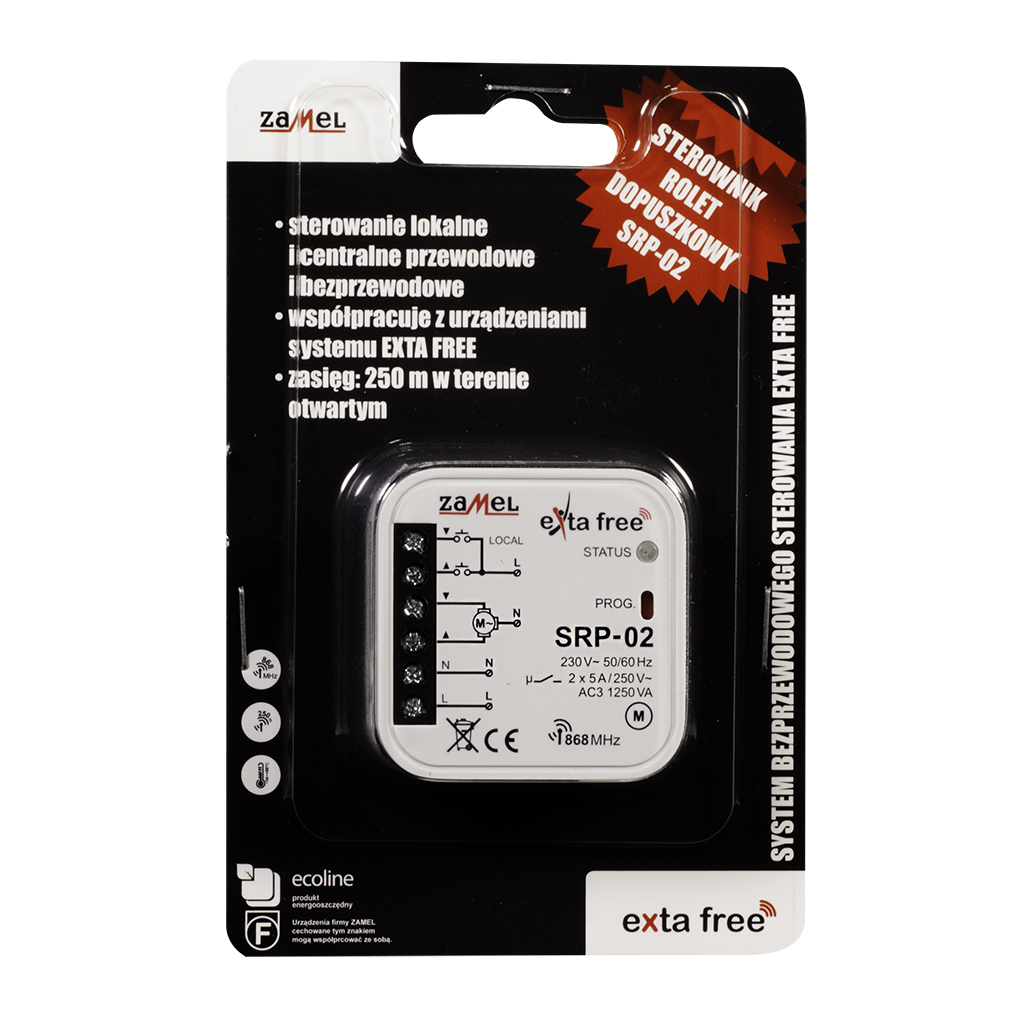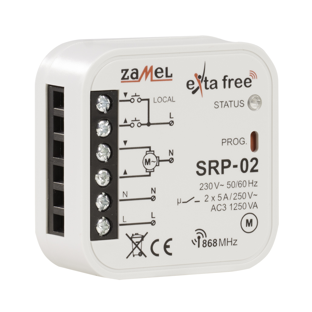 Sterownik SRP-02 to dopuszkowy moduł sterowania roletami, który łączy funkcjonalność lokalnego sterowania przewodowego z wygodą obsługi zdalnej w systemie Exta Free. Dzięki niemu możesz automatycznie podnosić i opuszczać rolety jednym naciśnięciem przycisku lub pilotem, a także zapisać ulubione położenia (tryby komfortowe).