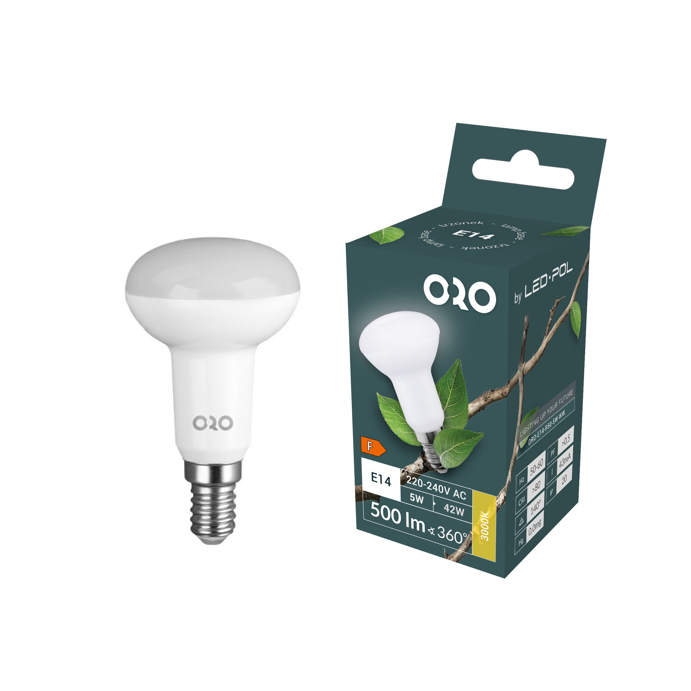 Źródło światła ORO-E14-R50-5W-WW to nowoczesna żarówka LED reflektorowa w kształcie R50, wyposażona w gwint E14 (mały gwint). Przy mocy 5 W emituje strumień świetlny na poziomie 500 lumenów, co odpowiada tradycyjnej żarówce reflektorowej o mocy około 40 W, zapewniając jednocześnie niższy pobór energii.